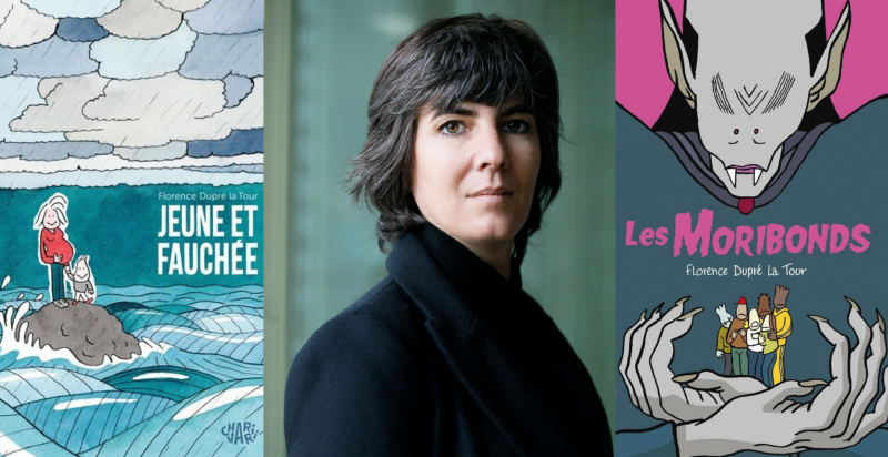 Florence Dupré La Tour viendra dédicacer sa rentrée en BD. D'abord avec Les Moribonds, réécriture jubilatoire de la figure du vampire qui sert un récit de lutte des classes qui va s'inverser dans un monde finissant, ravagé par la prolifération de morts-vivants, les moribonds. Avec brio, Florence Dupré La Tour s'amuse de la littérature de genre pour lui donner une aura sociale et politique qui trouvera des échos certains avec notre quotidien. Puis avec Jeune et Fauchée, dans laquelle elle continue son travail autobiographique entamé avec Cruelle, Pucelle et Jumelle, en évoquant cette fois ses années de précarité et le rapport à l'argent de sa famille et de son entourage, qui influença son propre rapport à l'argent ou plutôt son manque d'argent.
